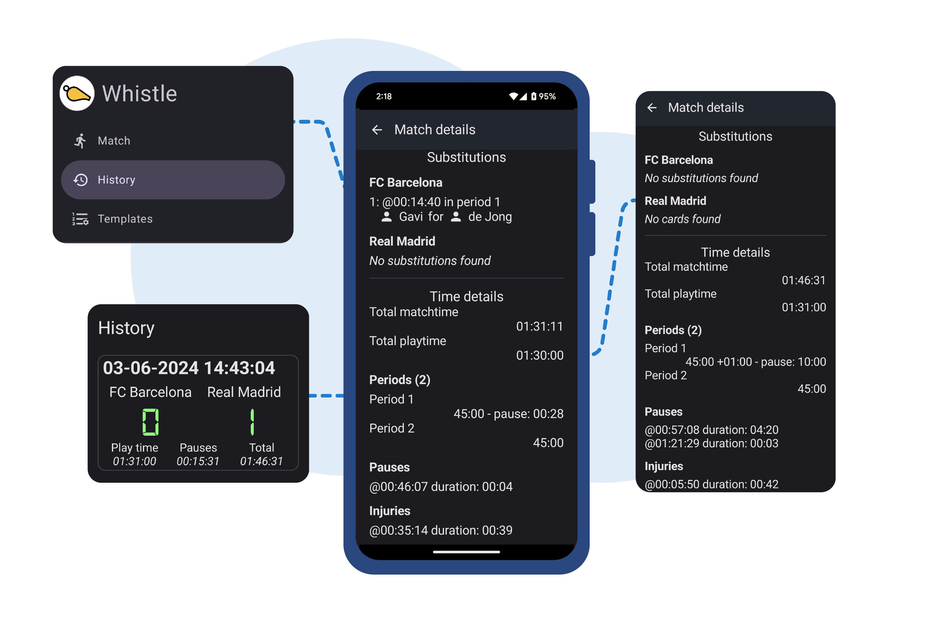 Even the Whistle app on the devices of the coaches and supporters can be linked to the same match, they all instantly receive the match updates as you make them!